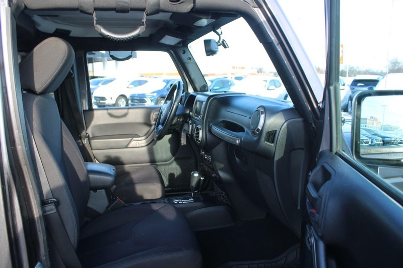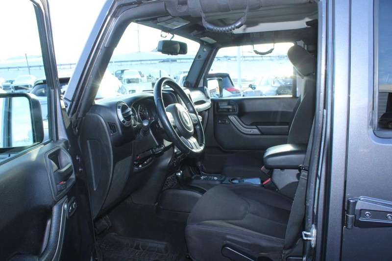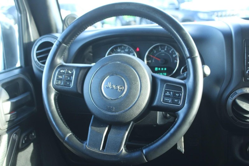It has satellite radio capabilities. The vehicle features a hands-free Bluetooth phone system. This mid-size suv has a V6, 3.6L high output engine. When you encounter slick or muddy roads, you can engage the four wheel drive on this unit and drive with confidence. With the keyless entry system on this Jeep Wrangler you can pop the trunk without dropping your bags from the store. This unit emanates grace with its stylish gray exterior. Maintaining a stable interior temperature in it is easy with the climate control system. It has heated side mirrors to keep your vision clear in winter weather. The Jeep Wrangler has an automatic transmission. Enjoy the tried and true gasoline engine in this unit. Anti-lock brakes are standard on the vehicle. The fog lights cut through the weather so you can see what's ahead. Easily set your speed in this unit with a state of the art cruise control system. Increase or decrease velocity with the touch of a button.