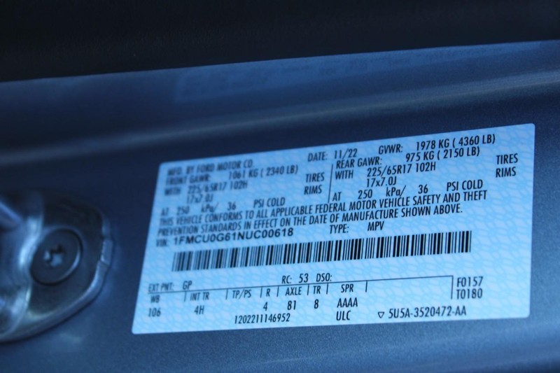 Equipment Group 200A: 17" Shadow Silver-Painted Aluminum Wheels; 3.81 Axle Ratio; Unique Cloth Front Bucket Seats; 1.5L EcoBoost Engine; 8-Speed Automatic Transmission; 225/65R17 AS BSW Tires; TBD GVWR; AM/FM Stereo. Front and Rear Floor Liners Without Carpet Mats. Mini Spare Wheel. **Equipment listed is based on original vehicle build and subject to change. Please confirm the accuracy of the included equipment by calling the dealer prior to purchase.**